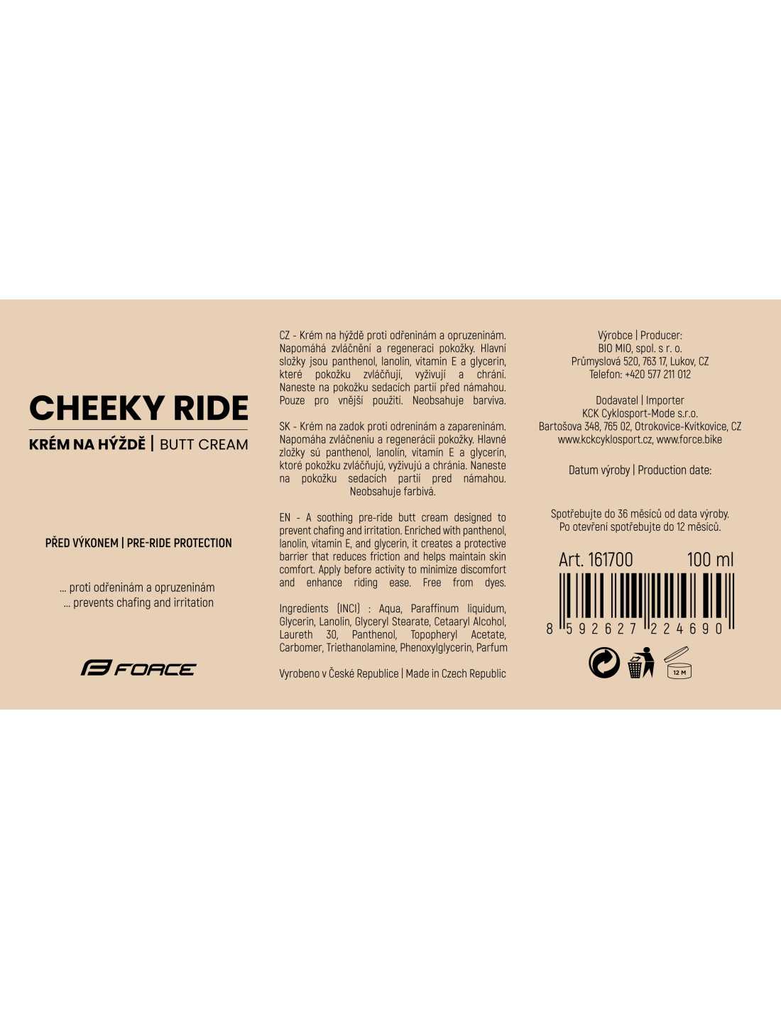 Nuestra crema para glúteos es perfecta para prevenir rozaduras e irritaciones. Esta crema especialmente desarrollada es ideal para cualquier persona que ejerza una presión adicional en sus áreas sentadas, ya sea durante deportes, largos períodos sentados u otras actividades exigentes. Gracias al pantenol, lanolina y la vitamina E, tu piel se mantiene nutrida, protegida y suave. Aplicar antes de la actividad física para máxima protección y regeneración. Apto para uso diario, elaborado cuidadosamente en la República Checa.