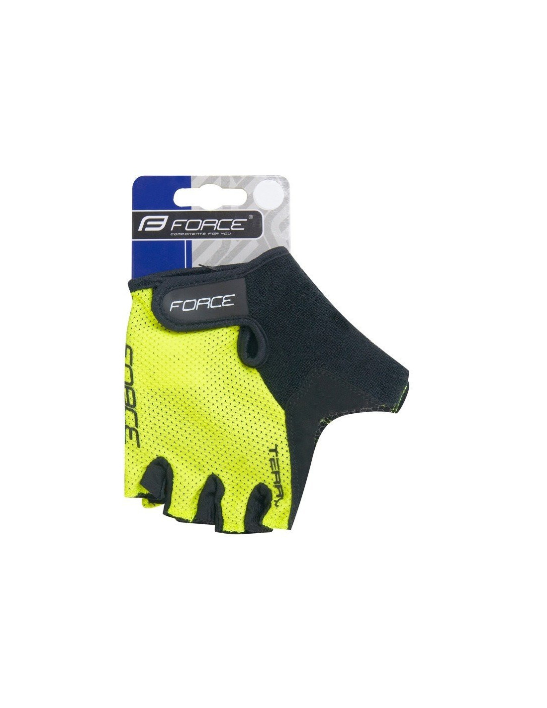 summer cycling gloves, unisex outer thumb side from soft terry for wiping the nose palm made from artificial leather with soft inserts grips are reinforced with artificial leather breathable upper mesh side material: 90% polyester, 10% elastane packed in polybag with FORCE card