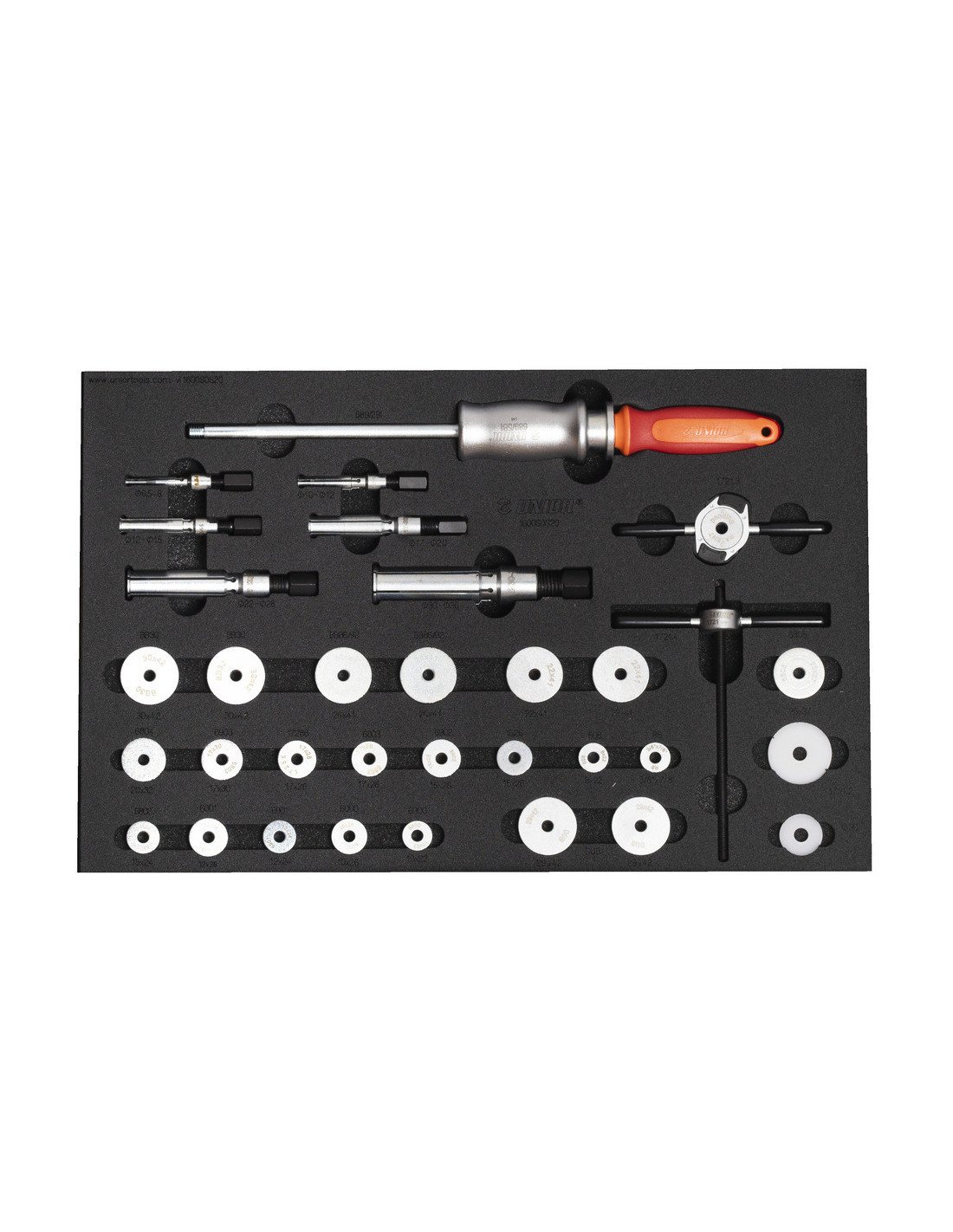 El kit de eliminación incluye un martillo de portaobjetos de servicio pesado con adaptadores que soportan la eliminación del rodamiento con dimensiones de rodamiento internas 6.5-8,10-12, 12-15, 17-20, 22-28, 30-36 mm.