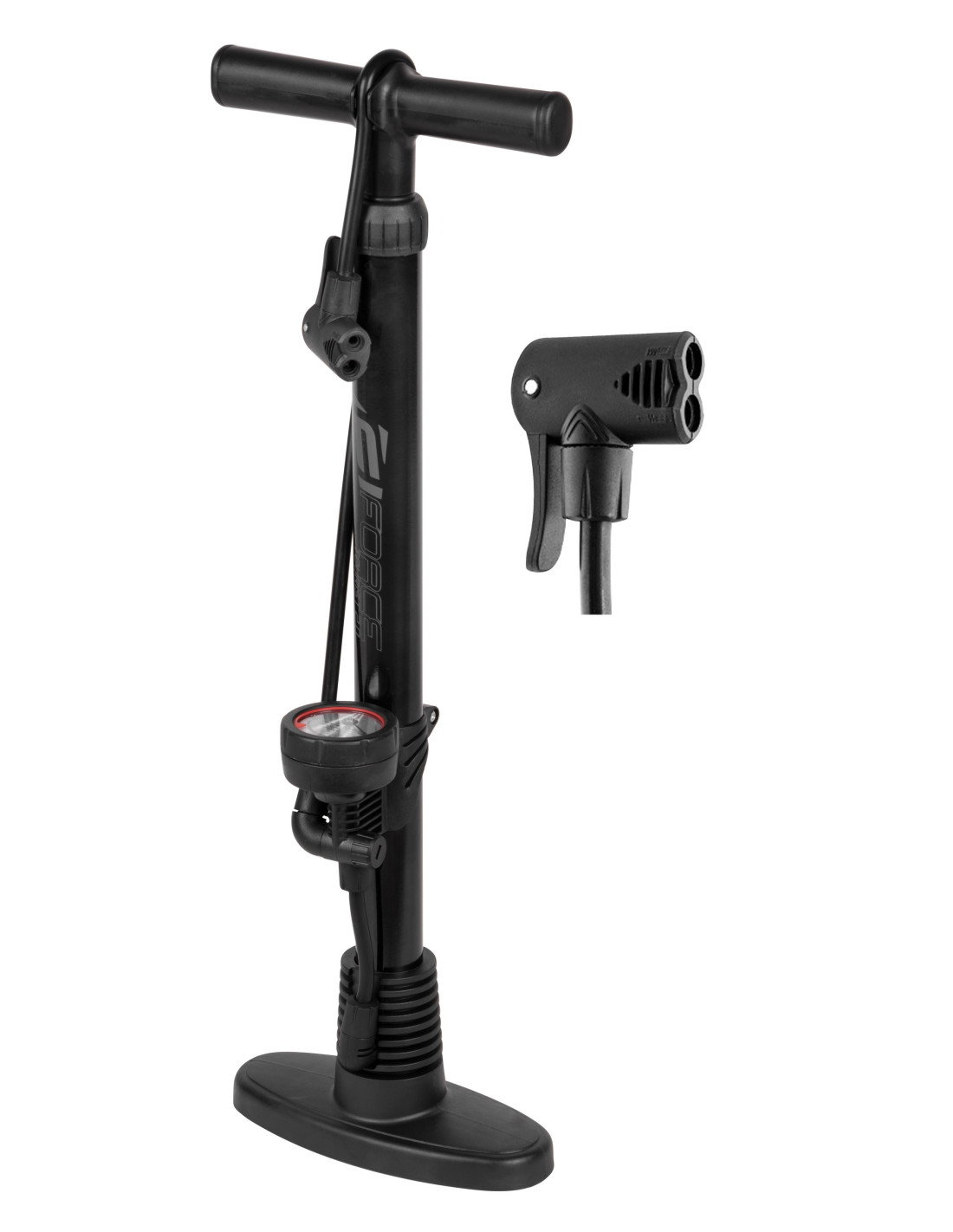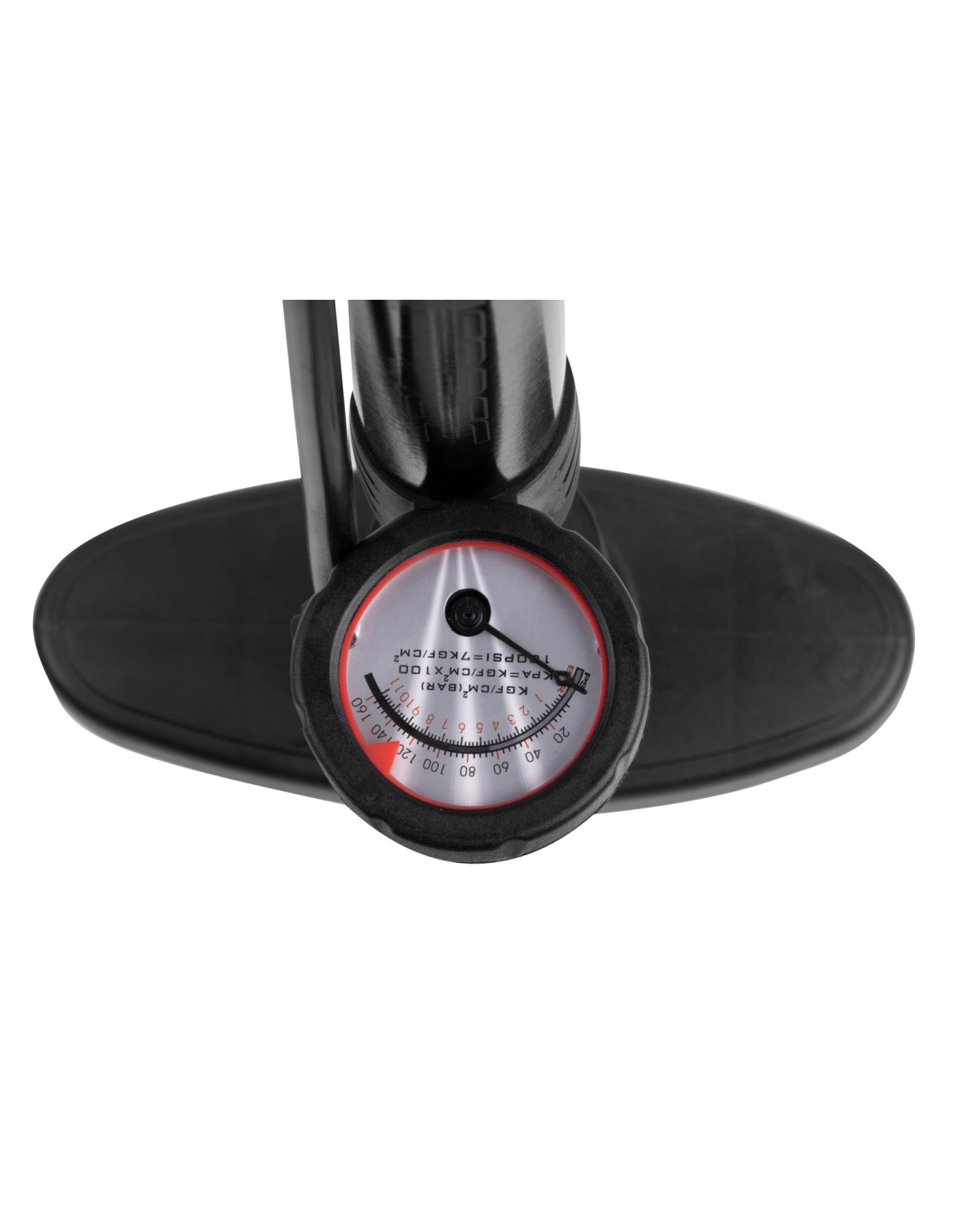 Cabeza diseñada para todo tipo de válvulas (AV - schrader, FV - presta, DV - dunlop) Con manómetro hasta 160 PSI/ 11 bar Material: Fe + plástico Altura: 62cm Peso: 860g Diseñado para uso HOBBY Embalado en tarjeta FORCE