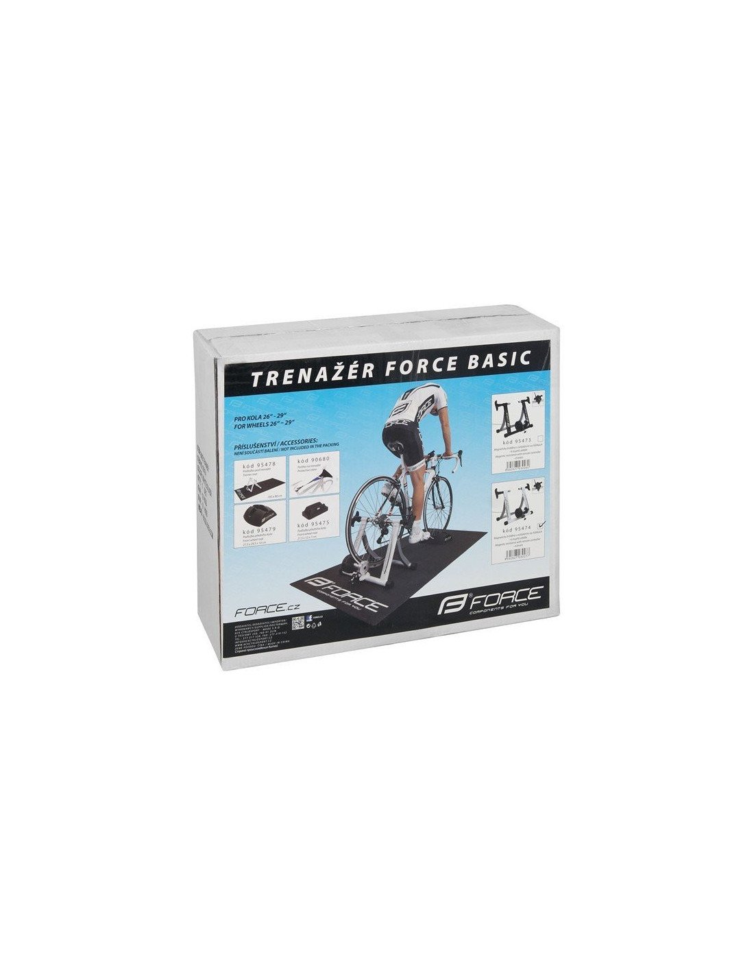 MAGNETIC brake - 6 magnets, designed for 26 - 28'' 29'' only with slick tires 5 degrees of resistance, resistance control lever on the handlebars alloy roller (reccomended use with tires designed for trainers) steel folding frame, rear wheel fixed with 2 adjustable screws resistance is determined by combination of setting load and gears on bicycle depending on the speed (rpm) maximum resistance: max. res. level + highest gear + max. rpm (400 W) (optimal rotation speed: 90 - 100/ minute) designed for QR only (not for thru axle) QR is included designed for HOBBY use weight: 8 kg packed in FORCE box with czech/ english manual, including QR