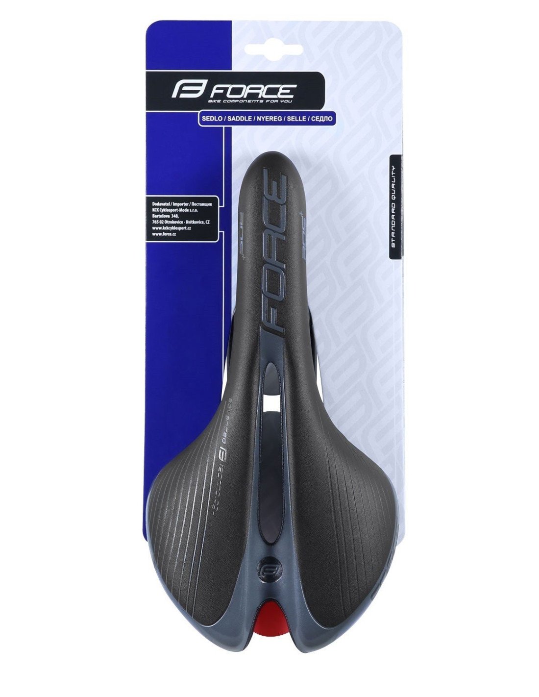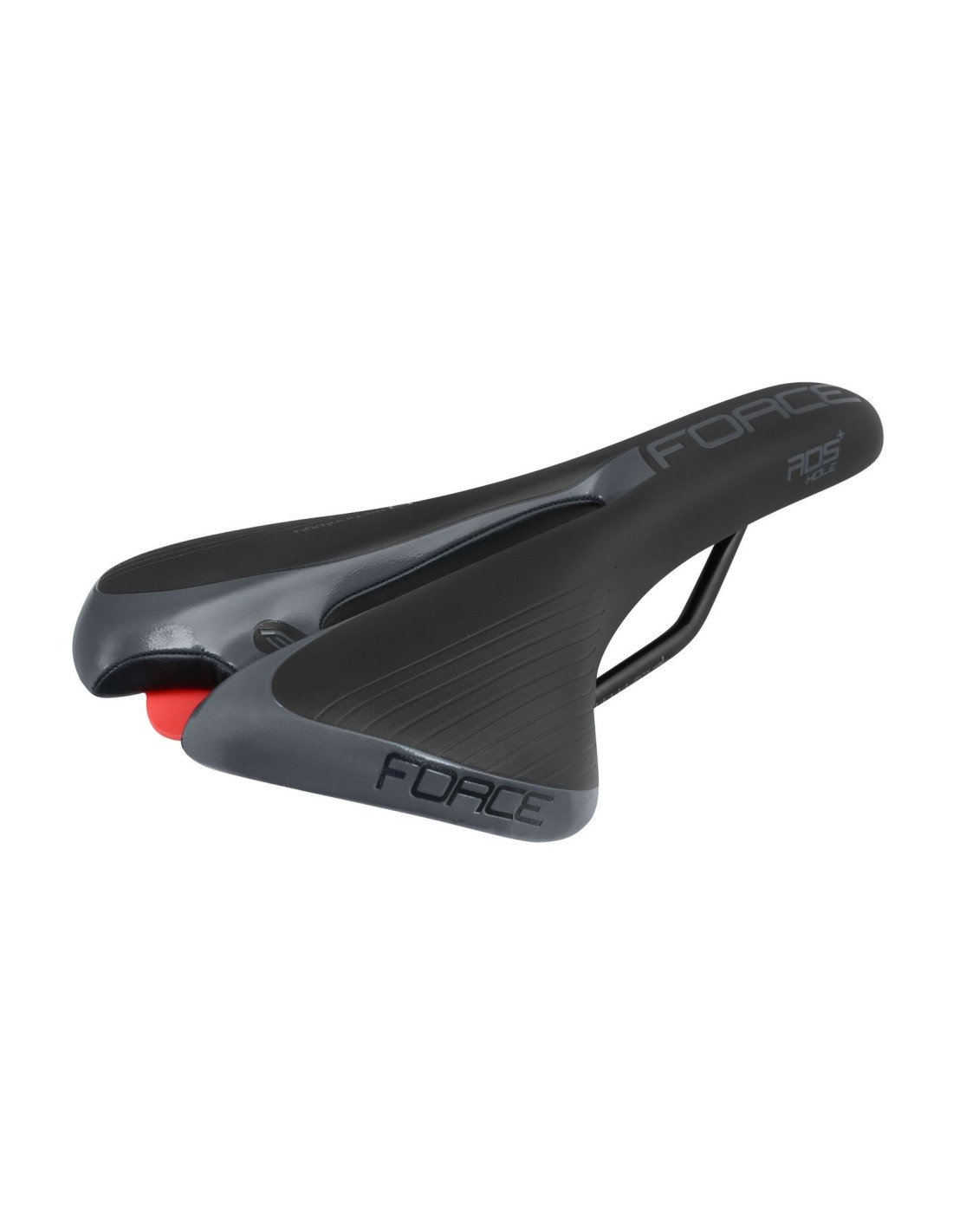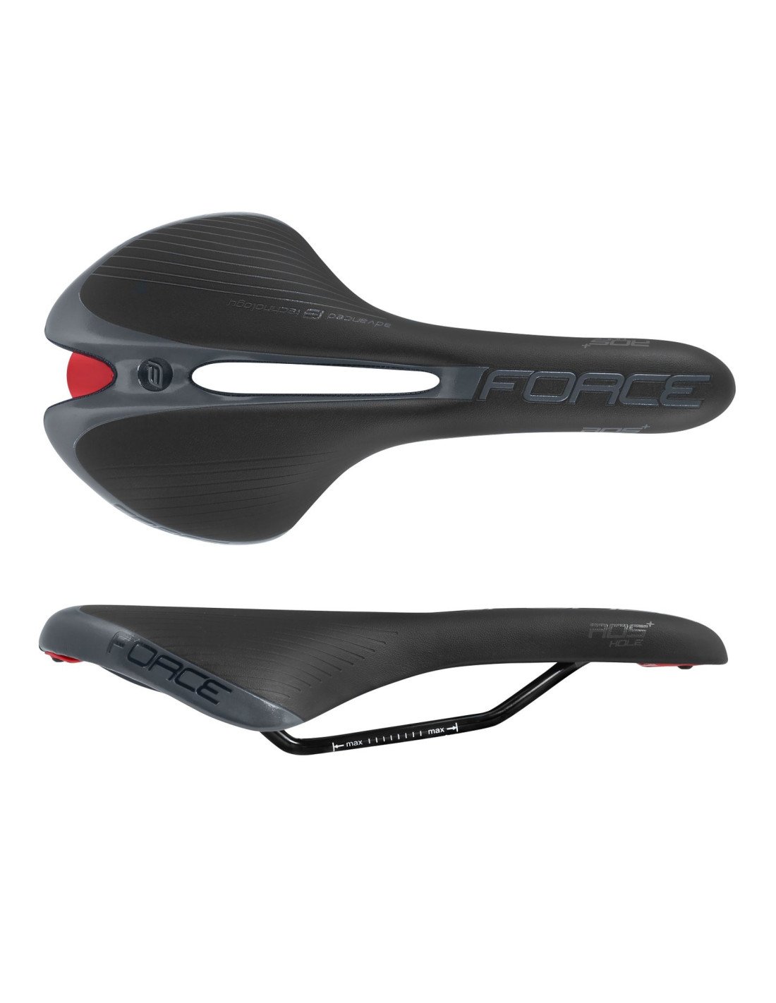 Logotipo y estructura de FORCE en relieve Modelo HOLE con orificio de ventilación central NO incluye abrazadera de tija Plataforma del asiento: nailon Rieles de acero con escala Material: cuero artificial Tamaño: 280 x 135 mm Peso: 303g Embalado en tarjeta FORCE